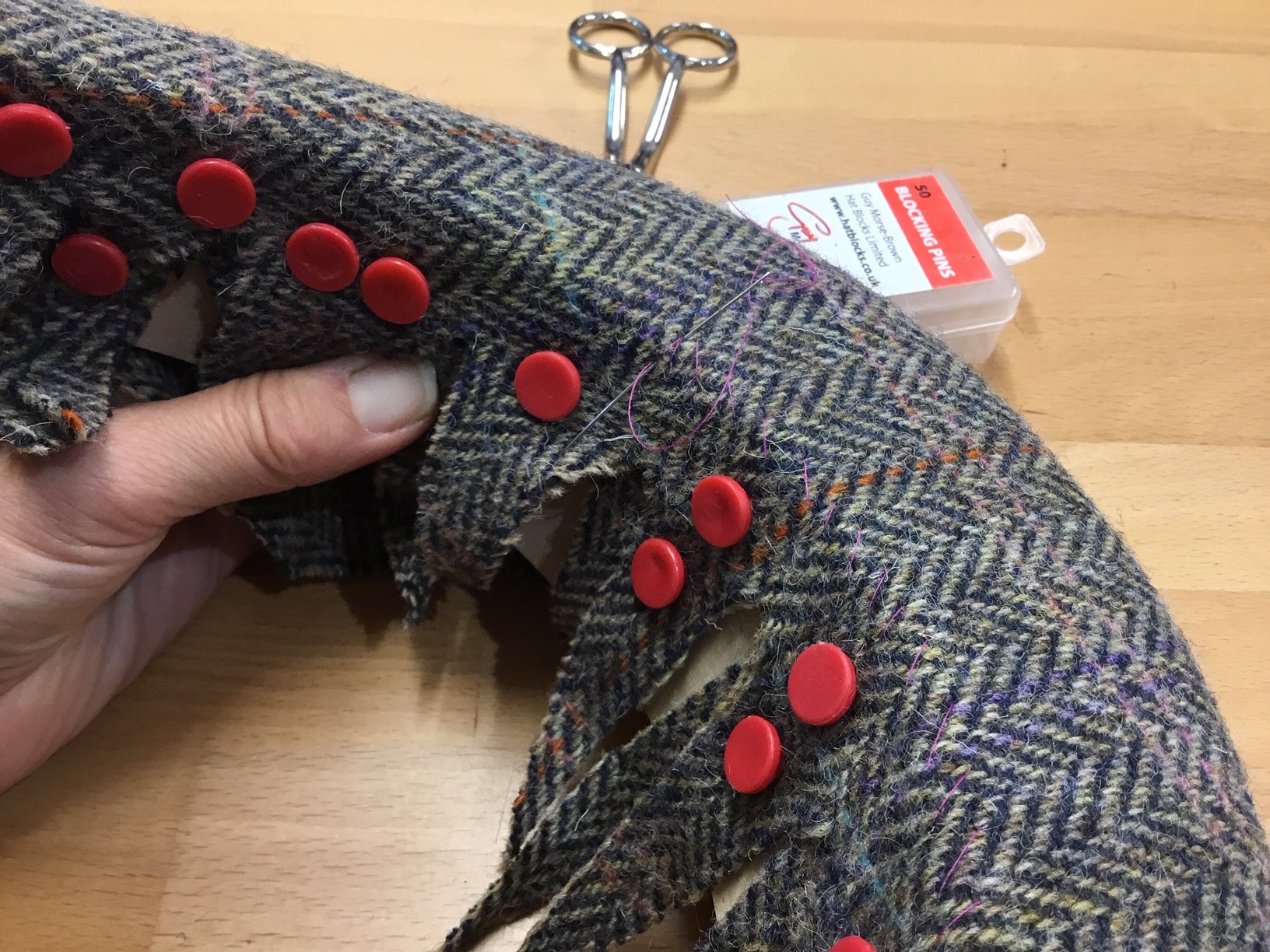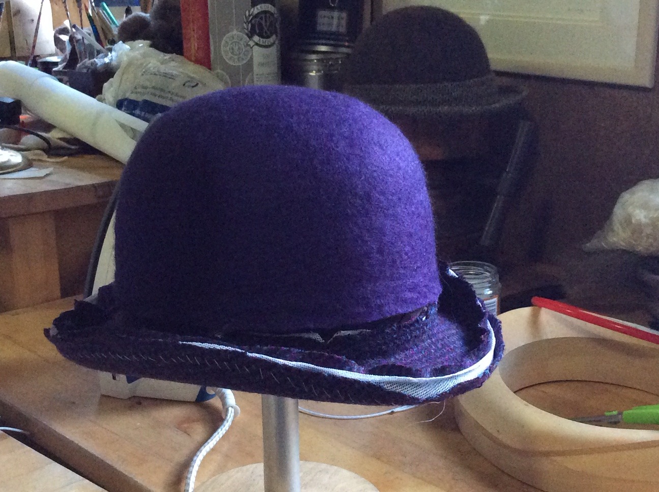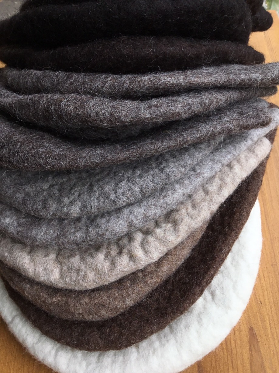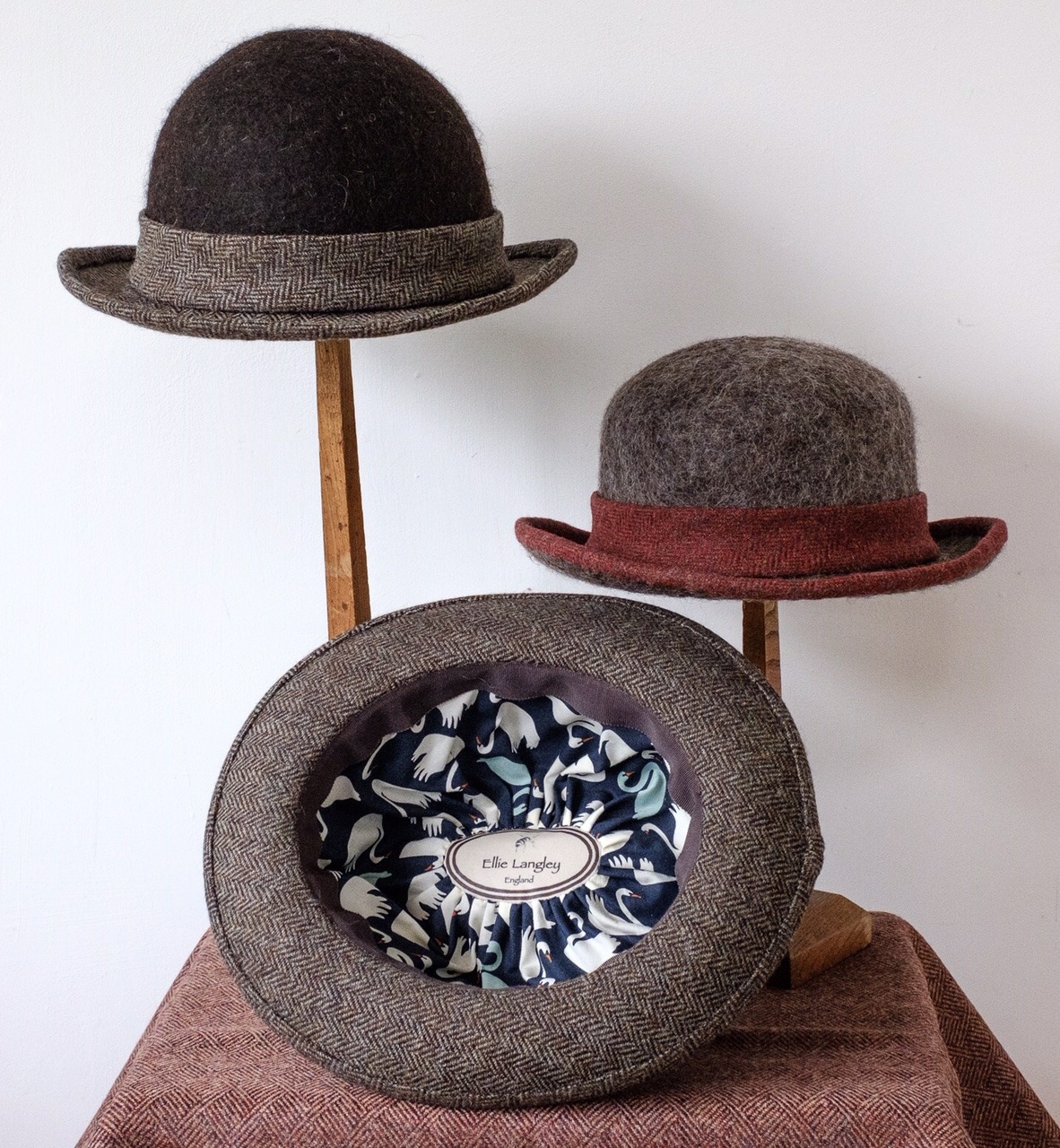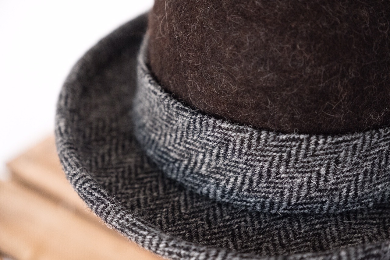 Having spent many years as a British wool specialist felt-maker making, among other things, many hundreds of felt hats, in the summer of 2015 Ellie undertook a millinery course in order to work on a new range of hats. She spent a year developing these hats which are made from a combination of felted crowns made of fleeces from her own sheep with brims of British wool tweeds, including Harris Tweeds. Increasingley Ellie uses tweeds woven from her own flock. The hats are handstitched and finished with Certified Organic Liberty Tana Lawn linings.